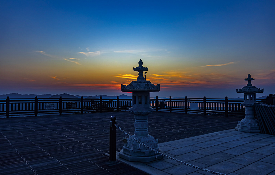 位于高丽山西麓,环境清幽,是观赏日落西海的完美场所。这里的落日景观堪列“韩国三大落霞美景”,深邃而浓烈。穿过古刹的前院,拾阶而上,可以看到落霞台的木平台。远远眺望,岛屿似浮在海面,剪影与暮色交融,引得时光停驻。冬季尤为迷人,夕阳即将接触海平面的瞬间金光赤红,共染海天一色。需要注意的是观景台山风较大,最好在日落前提早抵达。木平台周围清理完善,可以轻松进行三脚架摄影和夜间拍摄。