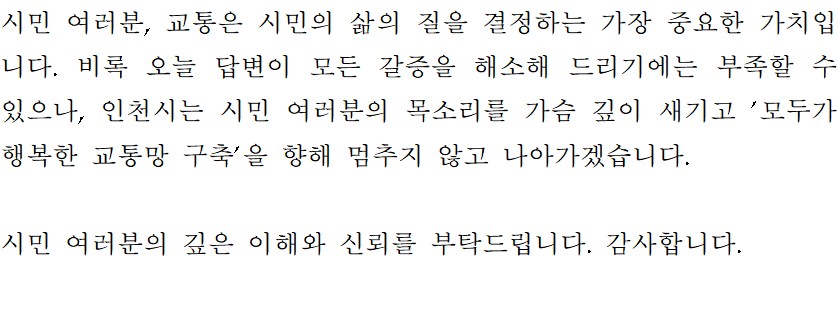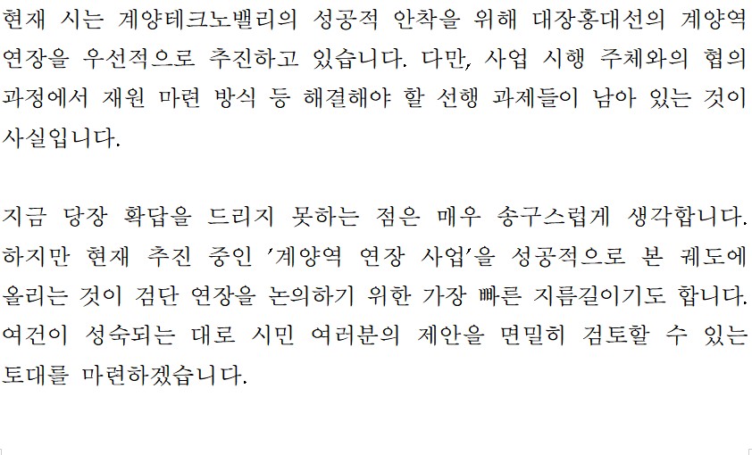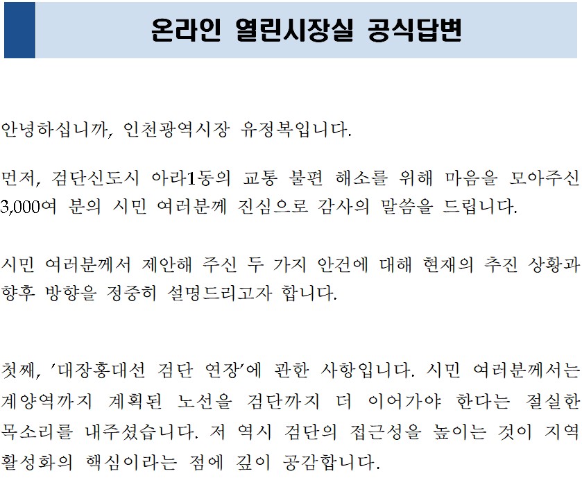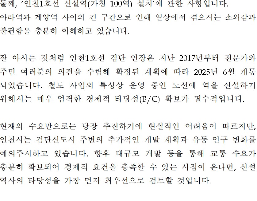 존경하는 유정복 시장님, 인천시민의 삶의 질 향상과 균형 발전을 위해 불철주야 헌신하시는 시장님의 노고에 깊은 감사와 존경을 표합니다. 저희는 인천 검단신도시 아라1동에 거주하며 지역 교통 문제 해결을 위해 자발적으로 조직된 '검단신도시 100역, 대장홍대선 추진위원회'입니다. 현재 저희 위원회에는 3,000여 명의 주민이 참여하고 있으며, 이는 아라1동 전체 약 2만 세대 주민들의 절박한 목소리를 대변하는 것입니다. 특히, 시장님께서 최근 주민설명회에서 대장홍대선의 계양역 연장을 발표하신 것에 큰 희망과 감사를 느꼈습니다. 이에 저희 주민들은 시장님의 적극적인 교통정책 의지에 공감하며, 한 걸음 더 나아가 검단신도시 교통 불균형 문제의 근본적 해결을 위한 두 가지 핵심 정책을 제안하고자 합니다. 1. 제안 배경 : 교통이용 기본권리에서 소외된 우리 동네. 검단신도시 아라 1동은 입주가 거의 끝난 상태입니다. 하지만 저희가 사는 아라1동 일대 이음1로 사거리 인근은 인천1호선 지하철역(아라역~계양역 간 무려 4km)과의 거리가 너무 멀어 매일같이 큰 불편을 겪고 있습니다. 유모차를 끌고, 아이들의 손을 잡고, 출근길에, 장 보러 갈 때마다 1.8km 이상을 걸어가거나 버스를 30분기다려 타고 다시 지하철로 갈아타야 합니다. 비 오는 날, 추운 겨울날, 무거운 짐을 들고 이동하는 것은 정말 힘듭니다. 특히 어르신들과 임산부, 어린 자녀를 둔 가정은 더욱 어려움이 큽니다. 우리도 인천시민입니다. 같은 '교통분담금' 을 내고 살면서 왜 우리 동네만 이렇게 교통에서 소외되어야 하는지 억울하고 안타깝습니다. 시장님께서 추구하시는 '더 가까운 인천, 시민과 함께하는 인천' 을 만들기 위해, 저희 아라1동 약 2만 세대 주민들의 목소리에 귀 기울여 주시길 간곡히 부탁드립니다. 2. 주요 제안 내용 제안 1. 대장홍대선(서부광역철도) 검단(이음1로 사거리) 연장 추진 시장님께서 얼마 전 주민설명회에서 '대장홍대선을 계양역까지 연장' 하겠다고 발표하신 것을 알고 있습니다. 저희 주민들은 이 소식에 큰 감동과 희망을 느꼈습니다. 시장님의 결단에 진심으로 감사드립니다. 한 걸음 더 나아가: 계양역까지의 연장도 훌륭하지만, 한 정거장만(약3km) 더 연장하여 검단신도시 '이음1로 사거리'까지 노선을 확대해 주신다면, 저희 아라1동 약 2만 세대를 포함한 수많은 주민들의 교통 불편이 완전히 해소됩니다. 대장홍대선은 서울 서부권(홍대, 마포)과 부천을 직접 연결하는 황금 노선입니다 검단신도시 주민들의 주요 통근·통학·생활권이 바로 이 구간입니다. 계양에서 이음1로까지는 불과 한 정거장 거리로, 추가 비용 대비 효과가 매우 큽니다. ●스마트위드업 기업유치, 검단신도시의 발전, 인천시 전체의 경쟁력 강화에 크게 기여할 것입니다. 요청 사항: 시장님께서 이미 보여주신 적극적인 의지로, 대장홍대선이 계양을 넘어 검단신도시 이음1로 사거리까지 연장될 수 있도록 국토교통부, 경기도 등 관계 기관과 협의를 주도해 주시고, '5차 국가철도망 계획' 또는'제2차 도시철도망 구축계획'에 타당성검토가 반영될 수 있도록 힘써 주시길 간곡히 부탁드립니다. 제안 2. 인천도시철도 1호선 신설역 (가칭 '100역') 설치 추진 현황 및 주민 불편: 현재 인천 1호선 아라역과 계양역 사이는 무려 4km나 떨어져 있어, 일반적인 역간거리(0.9~1.5km) 2~3배를 초과합니다. 그 사이에 사는 수만 명의 주민들이 지하철을 이용하기 위해 매일 먼 거리를 이동해야 합니다. 제안 내용: 기존 인천 1호선 구간에 (가칭) '100역'을 신설하여, 우리 동네 주민들도 다른 지역 주민들처럼 편하게 지하철을 이용할 수 있게 해주십시오. 요청 사항: 인천교통공사 및 도시철도건설본부가 해당 구간의 신설역 타당성(B/C값 등)을 재검토하는 용역을 즉각 시행하도록 시장님께서 지시해 주시길 요청드립니다. 3. 기대 효과 본 제안이 수용될 경우: 아라1동 약2만 세대를 포함한 검단신도시 교통 소외지역 주민들의 불편이 근본적으로 해소됩니다 출퇴근 시간 단축, 교통비 절감, 자가용 이용 감소로 탄소배출 감소까지 주민들의 삶의 질이 크게 향상됩니다. 검단신도시의 정주 여건 개선과 지역 경제 활성화로 인천시 전체가 발전합니다 스마트위드업 등 기업 유치에 유리한 인프라가 구축됩니다. 시장님의 공약인 '더 가까운 인천, 균형 발전하는 인천'이 실현됩니다 4. 우리의 간곡한 부탁 존경하는 시장님, 저희 3,000여 명의 위원회 분들과 아라1동 약 2만 세대 주민들은 시장님을 믿고 있습니다. 시장님께서 최근 주민설명회에서 대장홍대선 계양 연장을 직접 약속해 주신 것처럼, 우리 지역 주민들의 목소리에도 귀 기울여 주시길 간곡히 부탁드립니다. 우리는 특별한 것을 요구하는 것이 아닙니다. 다른 인천시민들이 누리는 기본적인 교통 편의를 우리도 함께 누리고 싶을 뿐입니다. 시장님께서 앞장서 주신다면, 우리 주민들도 인천시의 발전을 위해 더욱 적극적으로 협력하고 동참하겠습니다. 시장님의 현명한 판단과 적극적인 조치를 간절히 기대합니다. 감사합니다.
