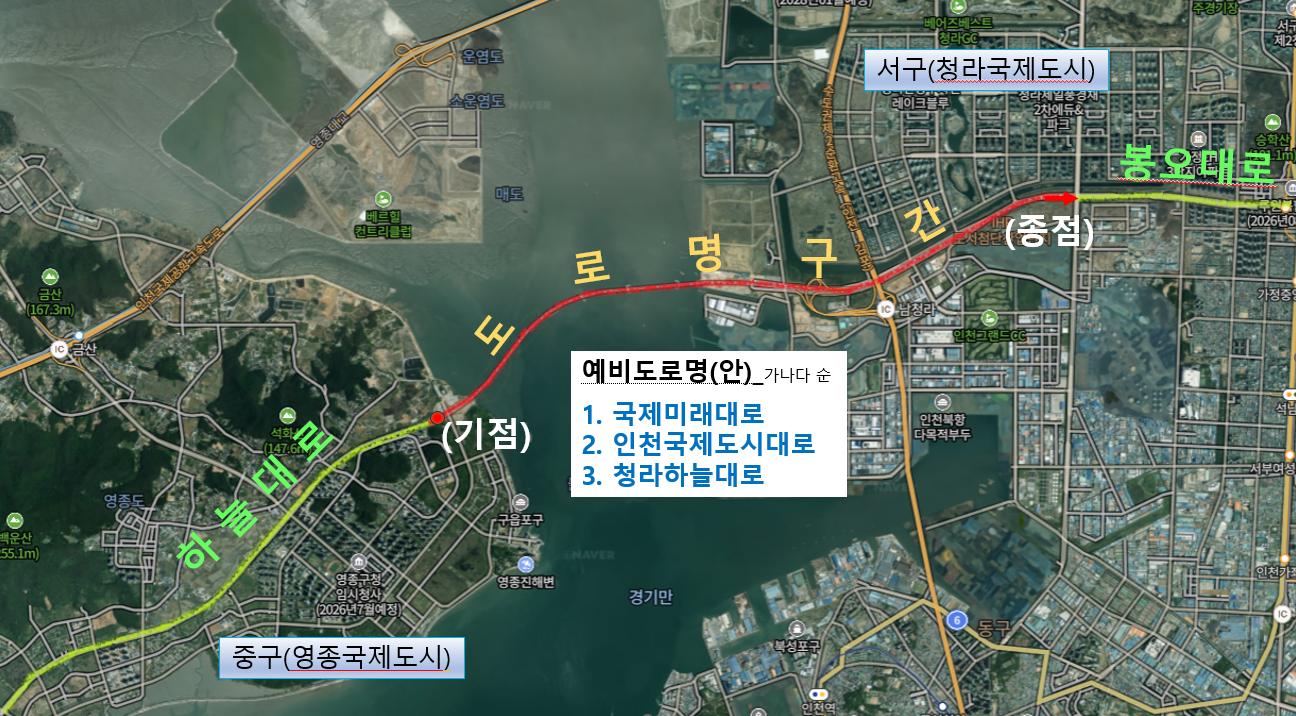영종과 청라를 연결하는 도로가 지난 1월에 개통됨에 따라「인천 중구 중산동에서 서구 청라동」을 연결하는 도로구간의 도로명을 선정하고자 합니다. 이 도로는 중구 하늘대로 종점에서 서구 봉오대로 시점까지 연결되는 8.1km 구간의 도로로, 두 지역 간의 이동 편의성과 지역 경제 활성화에 중요한 역할을 할 것입니다.