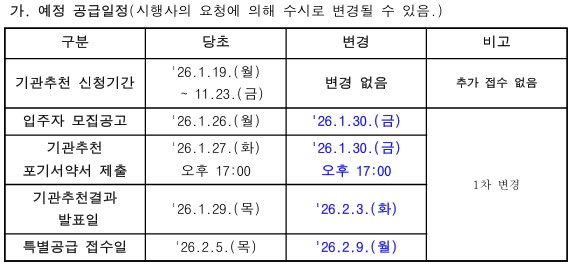 신청하신 분들께서는 추후 착오가 없도록 변경된 시행사의 기관추천 특별공급 안내문에서 공급 일정 등을
