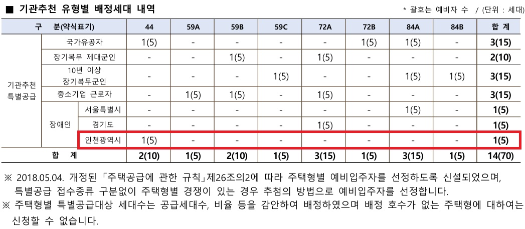 ※ 장애인 기관추천 특별공급 관련 개선사항(2022.1.3.시행) : 무주택 세대구성원 기간 및 인천시 연속 거주기간 등 자격요건 판단 기준일을