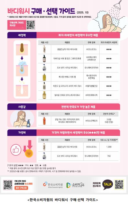 [바디워시 품질비교 결과] 피지 세정력 전 제품 우수, 미세먼지 세정력은 차이 있어