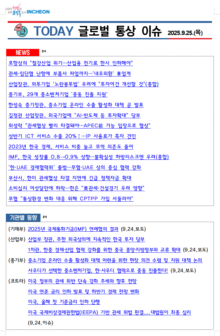 9.25.(목) TODAY 글로벌 통상 이슈(비상대응TF 관세정보 제공)
