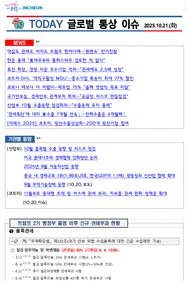 최신 관세뉴스, 수출 유관기관 동향, 트럼프 2기 행정부 출범 이후 신규 관세부과 현황, TF 참여기관 관세대응 현황 등을 모아서