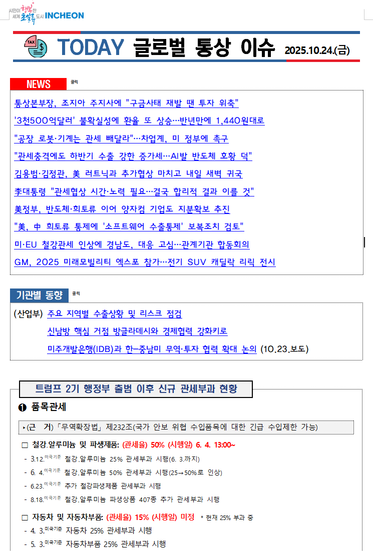 10.24.(금) TODAY 글로벌 통상 이슈(TF참여 기관 관세대응 현황 포함).hwp 미리보기 다운로드