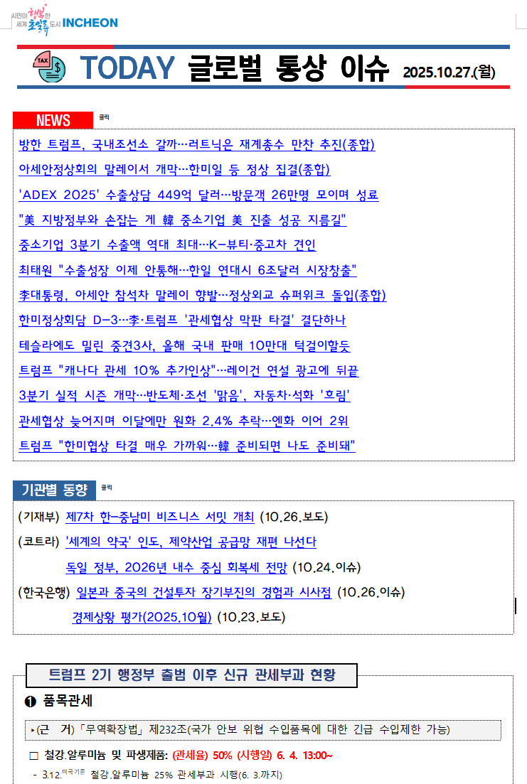 10.27.(월) TODAY 글로벌 통상 이슈(TF참여 기관 관세대응 현황 포함).hwp 미리보기 다운로드