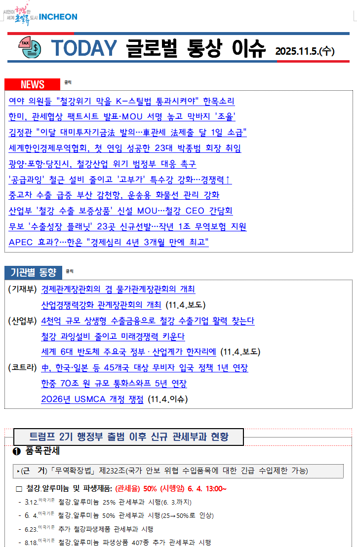 최신 관세뉴스, 수출 유관기관 동향, 트럼프 2기 행정부 출범 이후 신규 관세부과 현황, TF 참여기관 관세대응 현황 등을 모아서