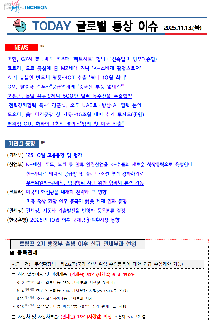 최신 관세뉴스, 수출 유관기관 동향, 트럼프 2기 행정부 출범 이후 신규 관세부과 현황, TF 참여기관 관세대응 현황 등을 모아서