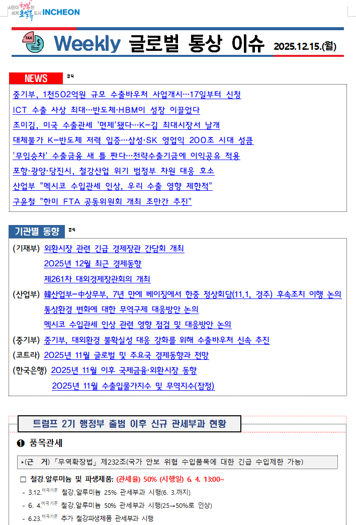 최신 관세뉴스, 수출 유관기관 동향, 트럼프 2기 행정부 출범 이후 신규 관세부과 현황, TF 참여기관 관세대응 현황 등을 모아서