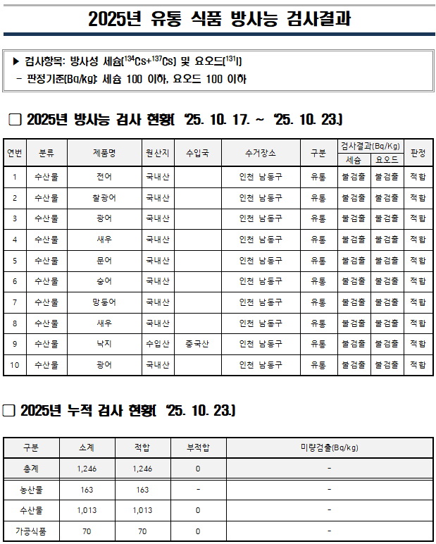 유통 식품 방사능 주간 검사 결과('25. 10. 23.)