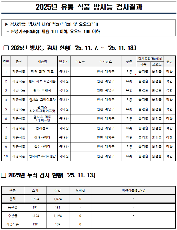 유통 식품 방사능 주간 검사 결과('25. 11. 13.)