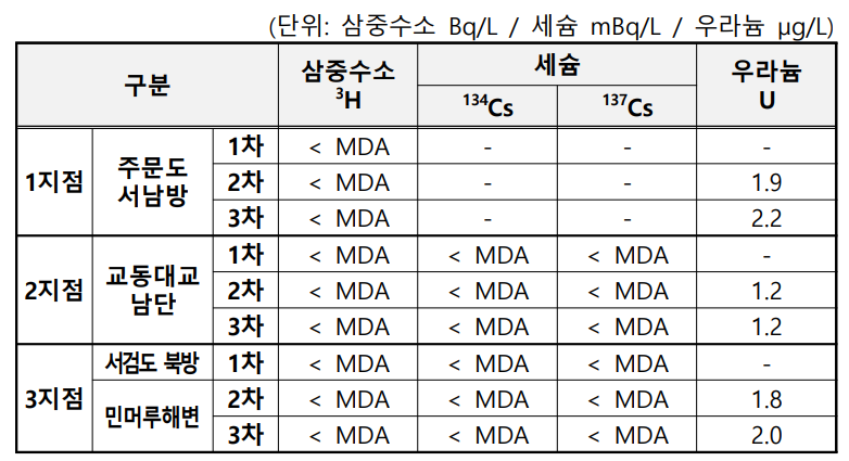 - 삼중수소·세슘 : 모두 최소검출가능농도(MDA) 미만