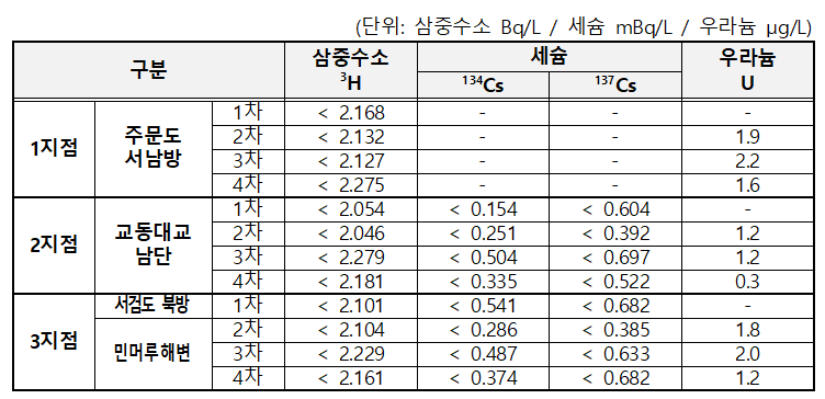 - 삼중수소·세슘 : 모두 최소검출가능농도(MDA) 미만