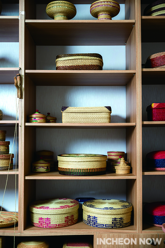 “시간이 흐를수록 완초공예품의 빛깔은 깊어집니다. 반질반질한 윤기는 여전해 황금빛으로 일렁이고,. 형태는 세월의 멋을 고스란히 간직하죠.”