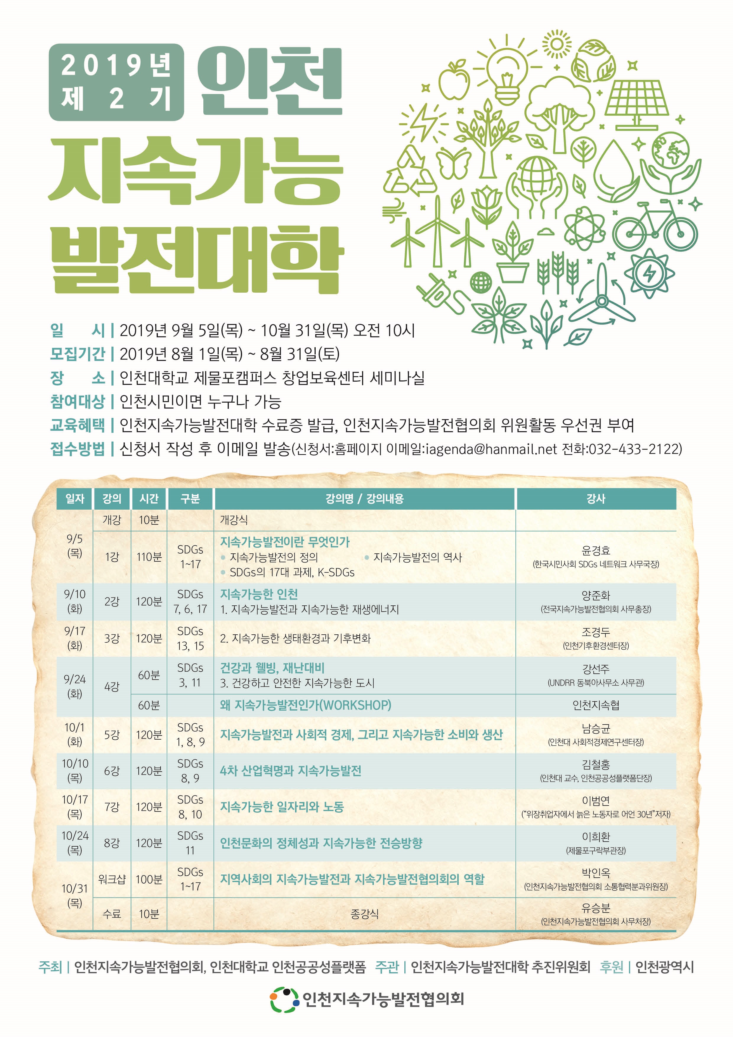 지속가능한 도시 인천을 위한 2019년 인천지속가능발전대학을 붙임과 같이 개강하오니 시민여러분의 많은 참여바랍니다.