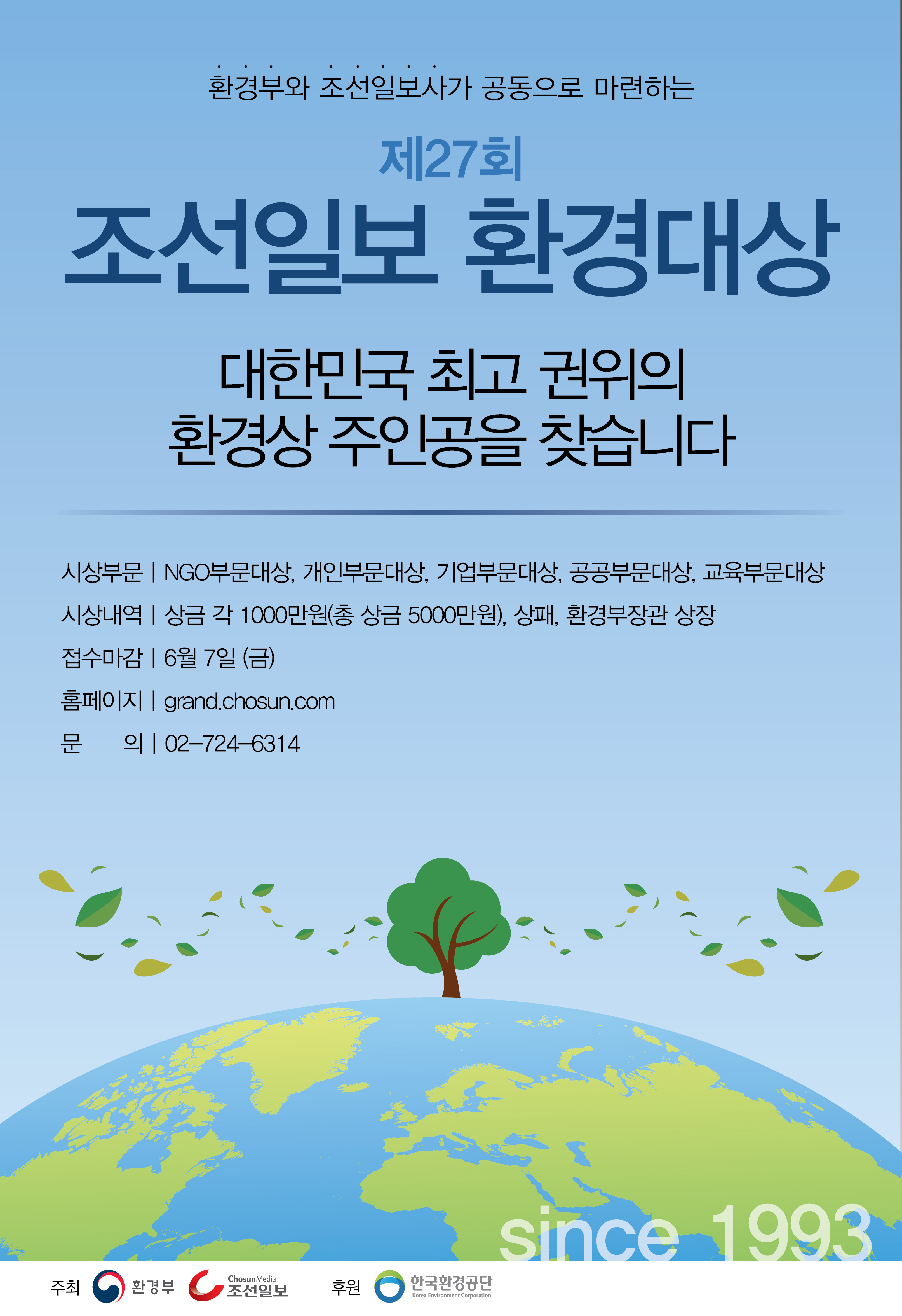 환경부와 조선일보사에서 환경보전을 위해 노력하고 있는 공로자를 발굴 시상하기 위해「제27회 조선일보 환경대상」을 개최하오니, 관심있는 분들의 많은 참여 부탁드립니다.
