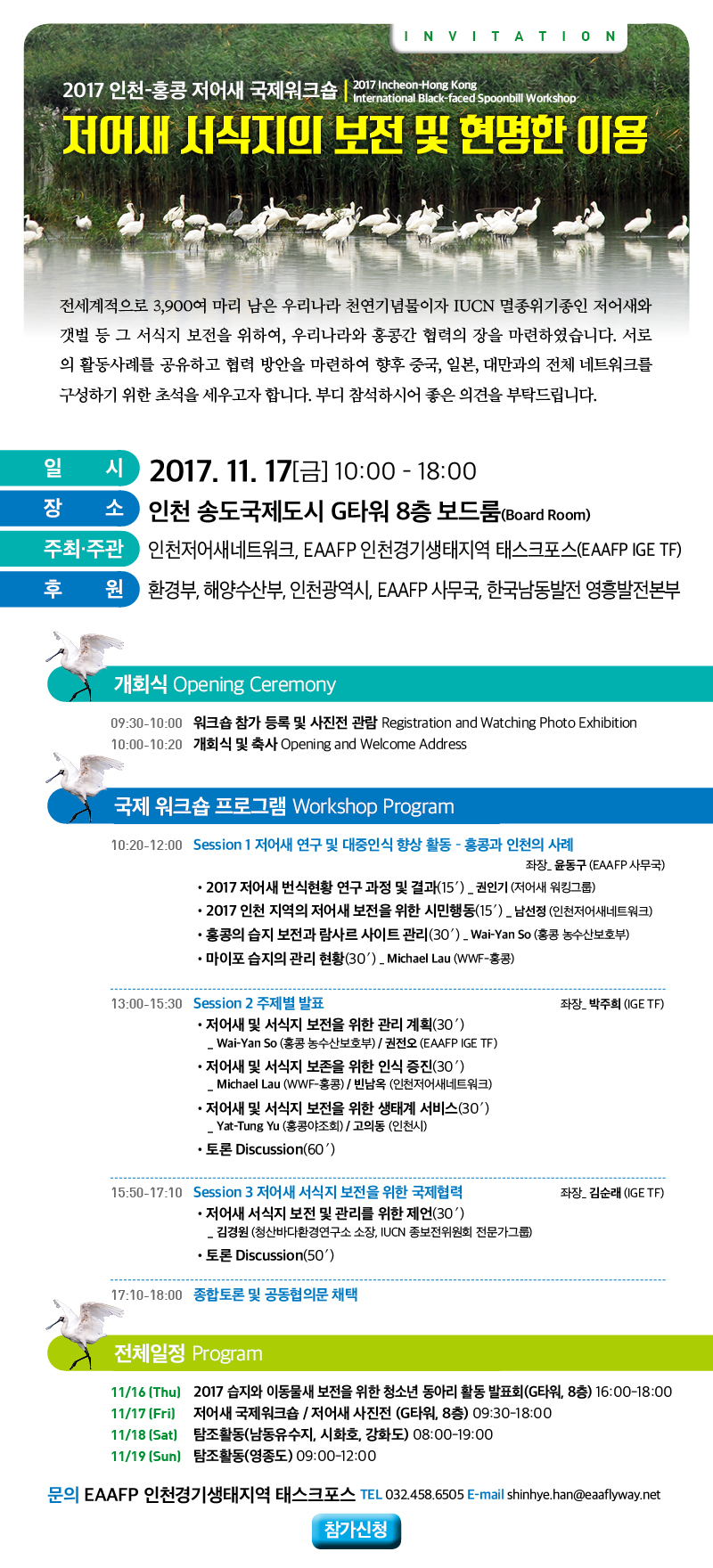 나. 행사명 : 2017 인천—홍콩 저어새 국제워크숍 (저어새 서식지의 보전 및 현명한 이용)