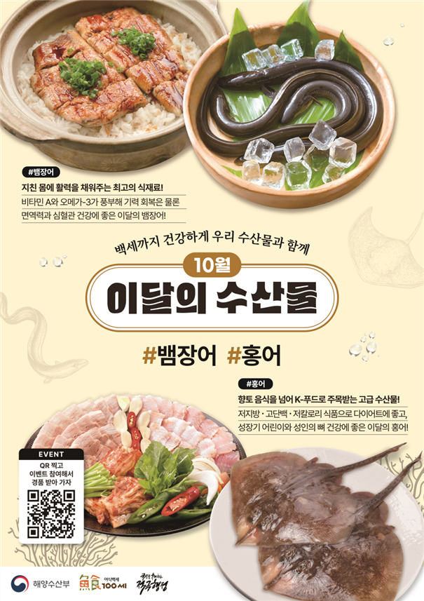 해양수산부(장관 전재수)는 10월 이달의 수산물로 뱀장어와 홍어를 선정했다.