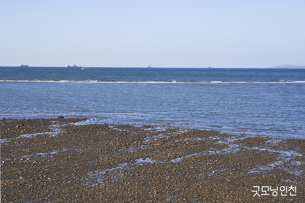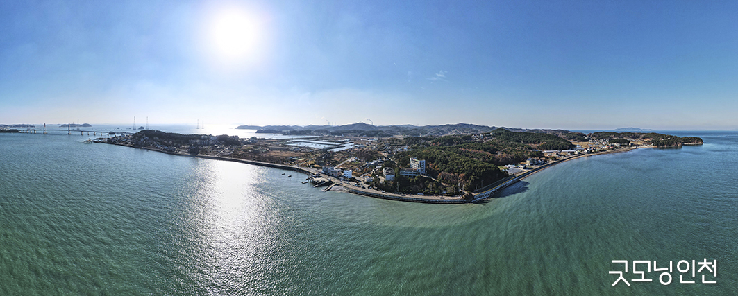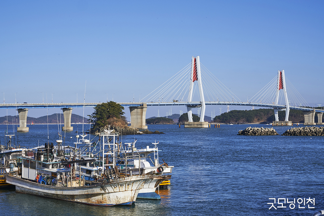 바다 물결이 일렁이고 멀리 영흥대교가 아득하게 걸려 있다.