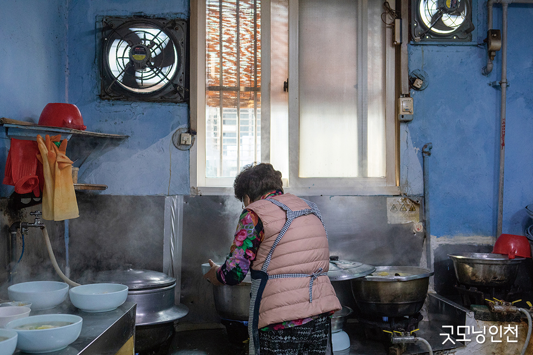 스물다섯에 시집와 칠십 평생, 이 골목을 벗어난 적이 없다. 연탄불에 육수를 올리고 반죽을 치대고 면을 썰었다. 끓여 내기가 무섭게 손님이 밀려들던 시절이 있었다. 주름이 깊어지고 허리가 굽어도 멈출 수 없었다.