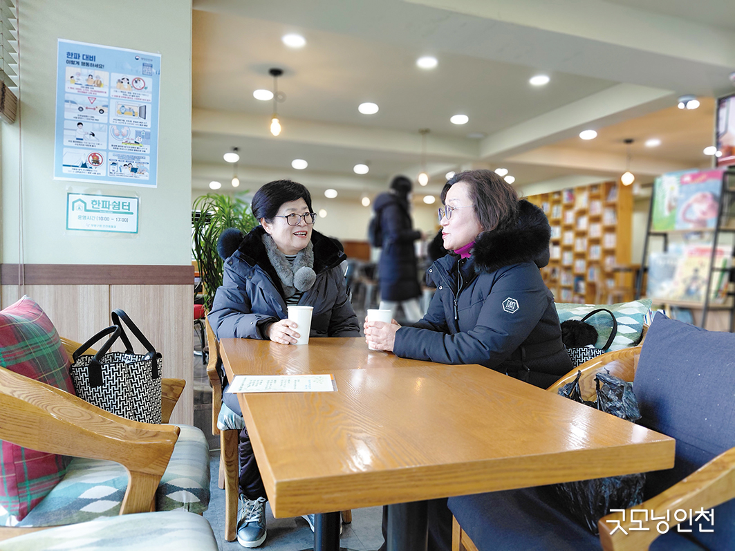 한파쉼퍼에서 김영자·김영희 시민이 이야기꽃을 피우고 있다.