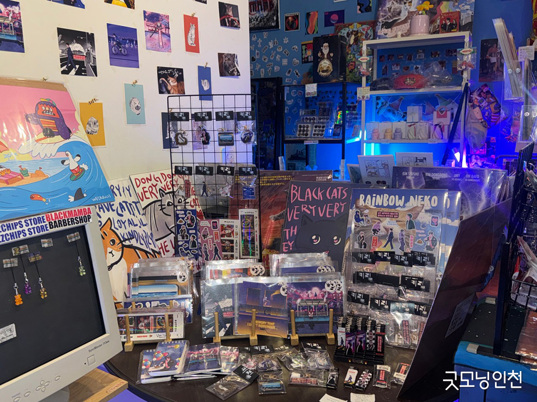 평범한 소품샵보다 개성 강한 물건을 구경하고 싶은 사람이라면 들르기 좋은 곳이다. 문을 열고 들어서는 순간, 여기가 부평인지 미국의 어딘가인지 헷갈릴 정도로 색색의 조명이 시선을 사로잡는다. 가게 인스타그램에 적힌 “유니크하거나 레트로하거나 힙하거나 귀엽거나 그런 게 좋다”라는 문장처럼, 이곳에는 키치한 아이템이 가득하다. 독특한 그래픽의 마스킹테이프부터 ‘다꾸’하기 좋은 스티커팩, 투명한 구슬이 알알이 꿰어진 비즈 팔찌, 아크릴 키홀더까지! 둘러보는 재미가 쏠쏠하다.
