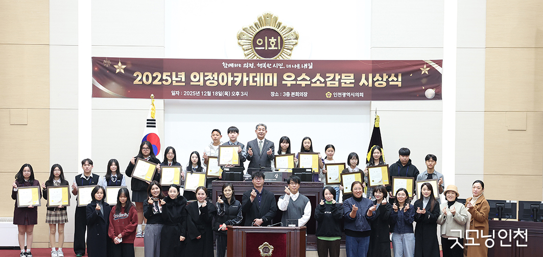 인천광역시의회는 ‘2025년 의정아카데미 우수소감문 시상식’을 개최하고 초·중·고등학생 60명에게 상장을 수여했다. 이번 시상은 지난해 11월까지 의정아카데미 프로그램에 참여한 학생 981명을 대상으로 소감문을 공모한 뒤, 심사를 거쳐 최우수·우수·장려 부문별로 각 20명씩 선정해 이뤄졌다.
