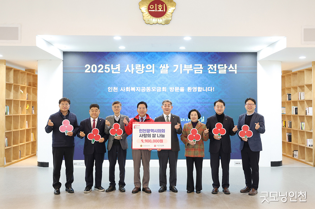 인천광역시의회는 저소득층 지원을 위한 ‘사랑의 쌀 기부금(990만 원)’을 인천사회복지공동모금회에 전달했다. 이날 전달된 기부금은 인천 지역 내 취약계층 300가구에 전해지는 등 어려운 이웃을 위한 나눔으로 이어졌다.
