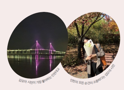 그런 제가 인천에서 가장 좋아하는 장소는 인천대교입니다. 해가 질 무렵 바다에 붉게 번지는 석양을 보면 모든 생각이 멎고, 해무가 내려앉을 때면 안개 속을 지나가는 고요함도 있기 때문입니다. 누구에게나 마음속에 특별한 의미를 품은 도시가 하나쯤 있다면, 제게는 그 도시가 인천입니다. 앞으로 인천에서 엄마와 아빠처럼 많은 추억을 쌓아가고 싶습니다.