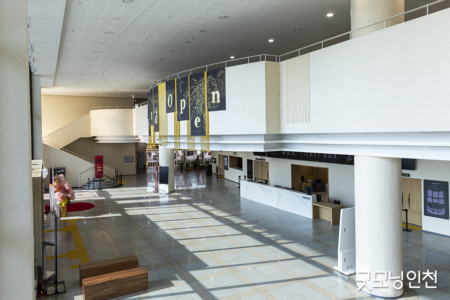 들어서면 가장 먼저 보이는 곳에 티켓 부스가 자리하고 있는데, 그 상단에 LED 전광판을 설치했다. 덕분에 공연 정보와 예매처 안내를 한눈에 확인할 수 있게 됐다. 또한 로비 한쪽에는 인천문화예술회관의 역사를 한눈에 살펴볼 수 있는 사진·포스터 전시가 마련돼 있다. 이 전시는 2025년 12월 말까지 운영될 예정으로, 회관의 지난 발자취를 보고 싶다면 올해 안에 방문하는 것을 추천한다.