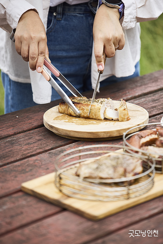 바다와 구분이 안 될 정도로 푸르던 하늘은 어느새 붉은 빛으로 번져간다. 바다 위로 노을빛이 퍼지고, 저 멀리 보이는 도심 건물에는 하나둘 불이 켜진다. 삼삼오오 자연을 즐기던 이들은 저녁 준비에 분주하게 움직인다. 캠핑장 안에는 지글지글 고기 굽는 소리와 뽀얀 연기가 폴폴 피어난다.