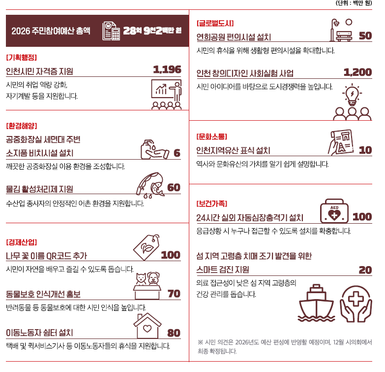 ‘2025년 주민참여예산 한마당 총회’에서 총 28억 9천2백만 원 규모의 11개 주민참여예산사업을 선정했다. 올해 초 진행된 공모에는 231건의 시민 제안이 접수됐으며, 이 가운데 인천시민 자격증 지원, 이동노동자 쉼터 설치 등 시민의 일상과 밀접한 사업들이 최종 선정됐다. 시민이 직접 제안하고 함께 선택한 사업들을 살펴보자.