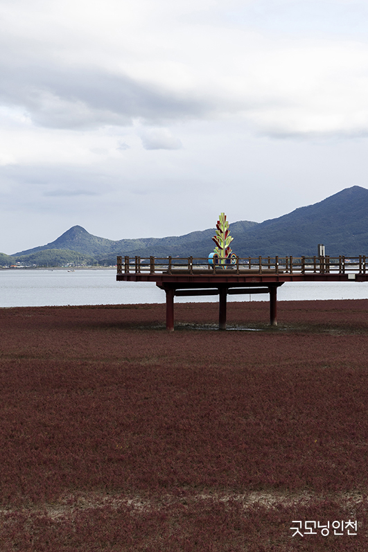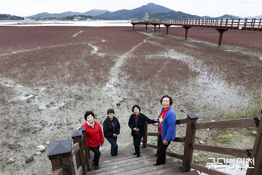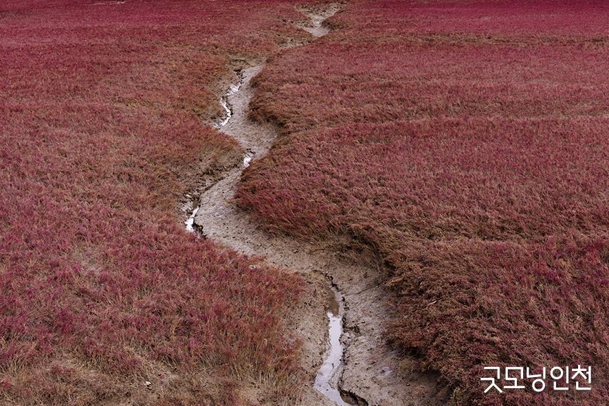 가을이 끝나기 전, 이 붉은 갯벌을 만나고 싶다면 인천 강화도 끝자락, 석모도로 향해보자. 석모대교를 건너 섬에 들어서면 바다와 하늘, 갯벌이 어우러진 웅장한 가을 풍경이 펼쳐지는데 특히 썰물 때 매음리 쉼터, 보문선착장 인근 도로, 나무깨 버스정류장 주변을 방문하면 붉게 물든 칠면초 군락의 압도적인 장관을 가까이서 만날 수 있다. 또 칠면초 군락지 너머로 펼쳐진 진강산의 부드러운 능선은 자연이 빚어낸 풍경화처럼 보는 이의 마음을 사로잡는다. 이처럼 칠면초 군락지는 산과 바다, 갯벌 등 자연에서 만날 수 있는 모든 풍경을 한눈에 담을 수 있는 곳이다. 특히, 붉은 갯벌 앞에서 사진을 찍으면, 자연의 색이 만들어낸 비현실적인 배경 덕분에 마치 영화 속 한 장면에 들어온 듯한 느낌을 받을 수 있다.