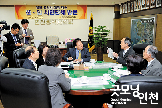 일본 교과서 왜곡에 반대하는 한국·일본 시민단체 회원들이 지난달 12일 인천시의회를 방문했다. ‘아시아 평화와 역사교육연대'의 양미강 공동운영위원장, '요코하마 교과서 채택 연락회’ 회원인 야기 토시나가 등 한·일 시민단체 회원 5명은 이날 노경수 시의회 의장을 면담했다. 이번 방문은 한·일 역사문제의 중요성을 인식하고 왜곡된 역사 교과서가 일본에서 채택되지 않도록 지방의회 차원의 협조를 요청하기 위해 이뤄졌다.
