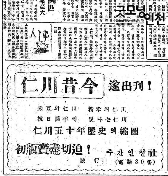 인천향토사의 원전(原典)이라고 할 수 있는 고일 著 ‘인천석금’ 발간 광고(1955. 6. 13). ‘미두의 인천. 정미의 인천, 항일 투쟁에 빛나는 인천’이라고 쓴 광고 문구가 이채롭다.
