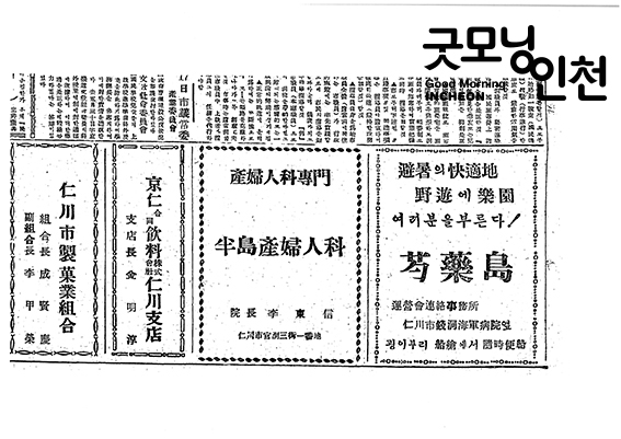 인천 앞바다의 작은 섬 작약도의 여름 광고.(1955. 6. 20) 중구 전동 해군병원 옆에 연락사무소가 있음을 알리고 있다.
