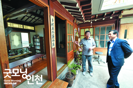 주인장 박차영 대표의 안내로 가옥을 둘러본 유정복 시장은 이곳에 오래된 한옥이 원형 그대로 보전되어 있다는 것에 무척 놀라며 신기한 표정을 지었다. 박 대표는 집의 구조와 연혁, 자신이 오랫동안 수집해온 LP판과 책들에 대해서 설명했다. 2층 카페 안의 파인 벽에는 당시 흙과 지푸라기를 사용한 흔적들이 드러나 있다.