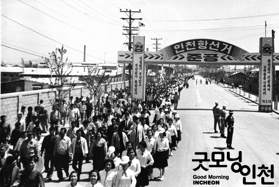 ① 갑문식 선거(DOCK) : 조수 간만의 차가 최고 10m에 달하는 인천항은 갑문식 선거 시설이 필요한 항구이다. 1911년 공사를 착수해 1918년 근대적 갑문식 항만인 제1도크가 건설되었다. 현재의 인천항은 1974년 5월 10일 제 2도크가 완공되면서 비로소 제 기능을 하게 되었다. 1966년 4월 소월미도와 월미도 사이를 매립하기 시작해 8년 만에 갑거(수로)와 갑문을 갖춘 국제항의 면모를 갖춘다. 이 공사에는 연인원 300만 명이 동원됐으며, 경부고속도로 서울-대전 간만큼의 콘크리트가 사용되었다. 사진은 준공식 날 기념식장(월미도)으로 향하는 학생, 시민들의 모습이다.