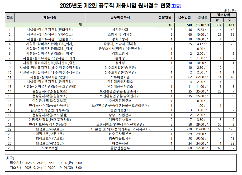 2025년도 제2회 인천광역시 지방공무원 임용시험 접수현황(최종)