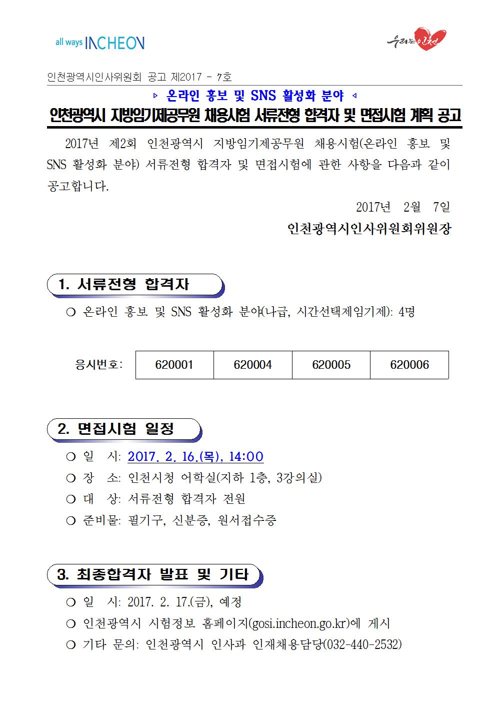 인천광역시 지방임기제공무원 채용시험(온라인 홍보 및 SNS 활성화 분야) 서류전형 합격자 및 면접시험 계획 공고