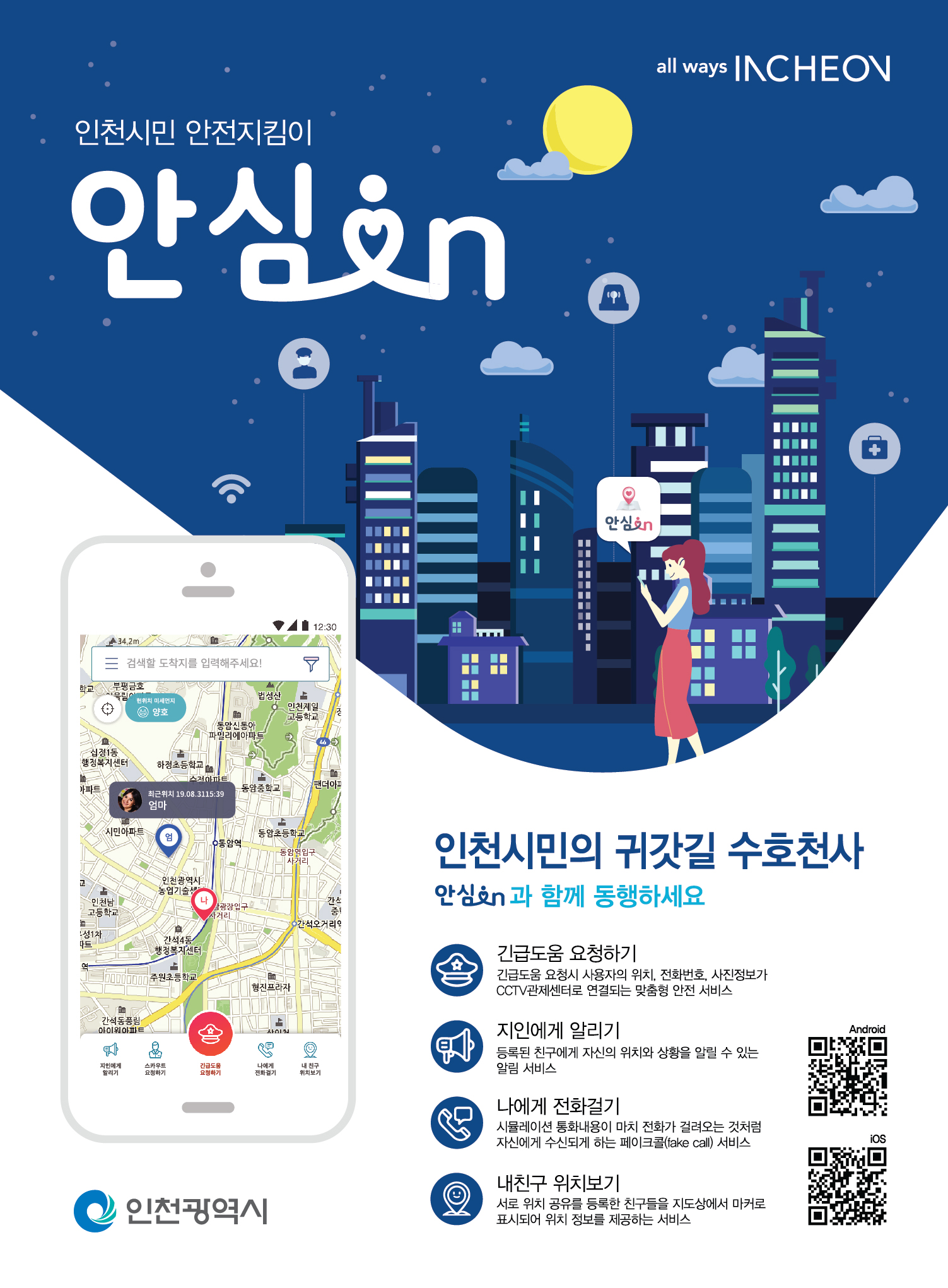 소지하고 계신 스마트폰을 활용하여 긴급상황 발생시 군ㆍ구 CCTV 통합관제센터 및 경찰과 연계한 위치확인기반 생활안전 서비스로 시민의 생활환경 조성을 위해 활용될 수 있도록 구현한 인천시가 운영하는 생활안전 공공앱(APP) 서비스입니다.