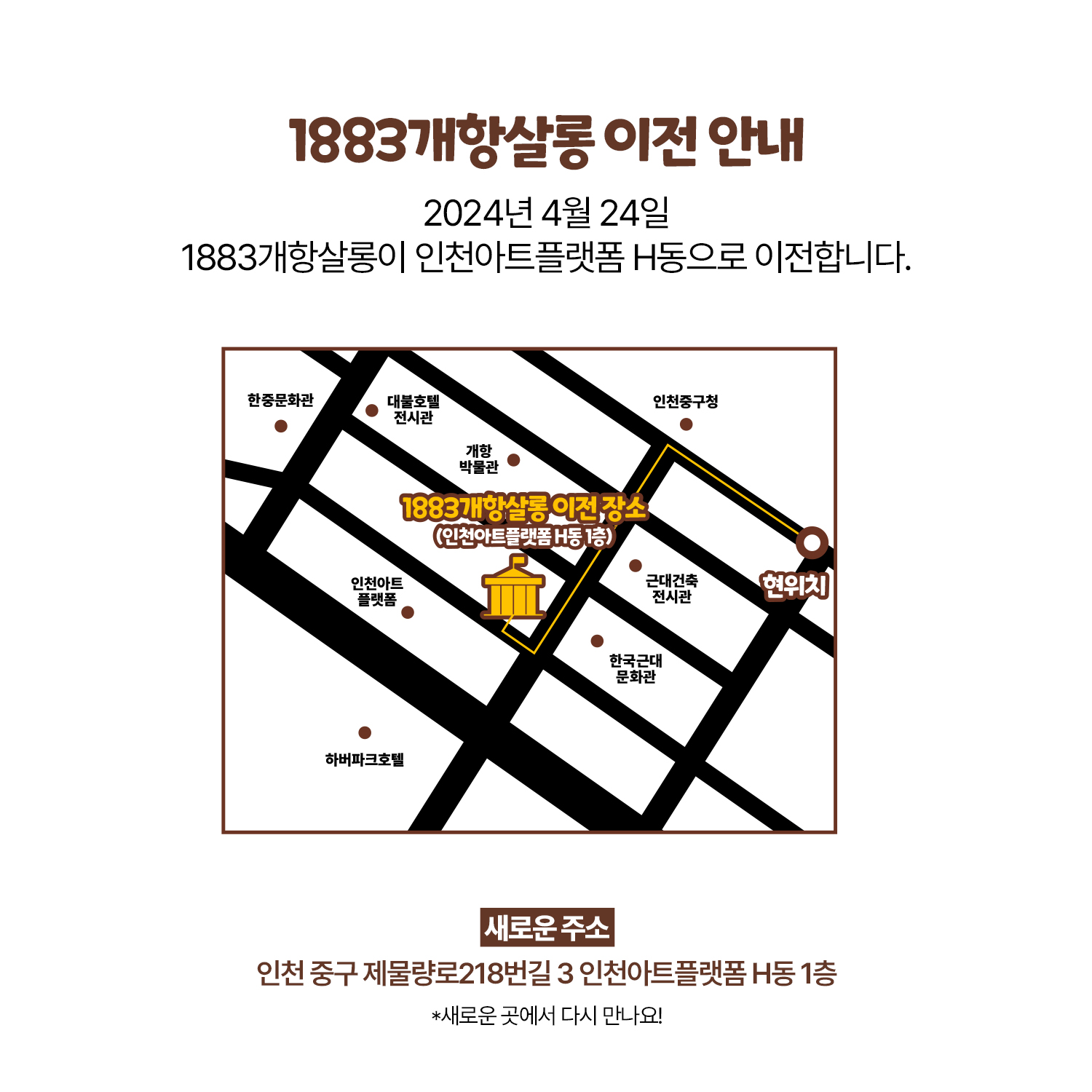 1883개항살롱(개항장 및 내항 현장지원센터)이 아래와 같이 이전합니다.🚩 이전위치: 인천 중구 제물량로218번길 3 인천아트플랫폼 H동, 1층