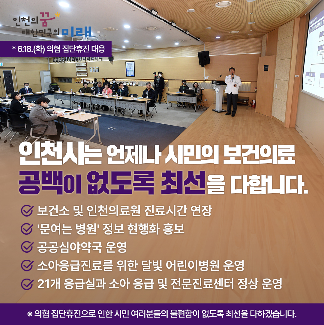 의협 집단휴진(6.18.) 대응 인천시 비상진료체계 운영 강화 모든 의원에 업무개시 명령 보건소 및 공공병원 진료시간 20시까지 연장※ 단, 옹진군과 서구는 보건소 내 진료실 미운영※ 인천의료원은 22:00까지 운영 문여는 병원 정보는 응급의료포털(E-Gen), 복지부 콜센터 129,건강보험심사평가원 '우리지역좋은병원찾기'에서 확인 공공심야 약국 29개소 → 31개소 확대 운영 소아응급진료를 위한 달빛어린이병원 운영(5개소) 21개소 응급실, 소아응급 진료센터 정상 운영 인천시 지역별 보건소 및 공공병원 연락처강화군 032-930-4047중구 032-760-6044동구 032-770-5722미추홀구 032-880-5323연수구 032-749-8042남동구 032-453-5082부평구 032-509-8261계양구 032-430-7856인천의료원 032-580-6000적십자병원 032-899-4000근로복지공단 인천병원 032-5000-114보훈병원 032-363-9800