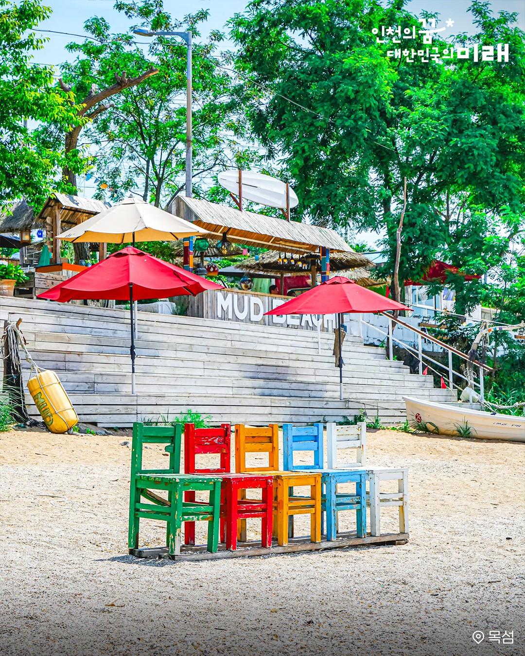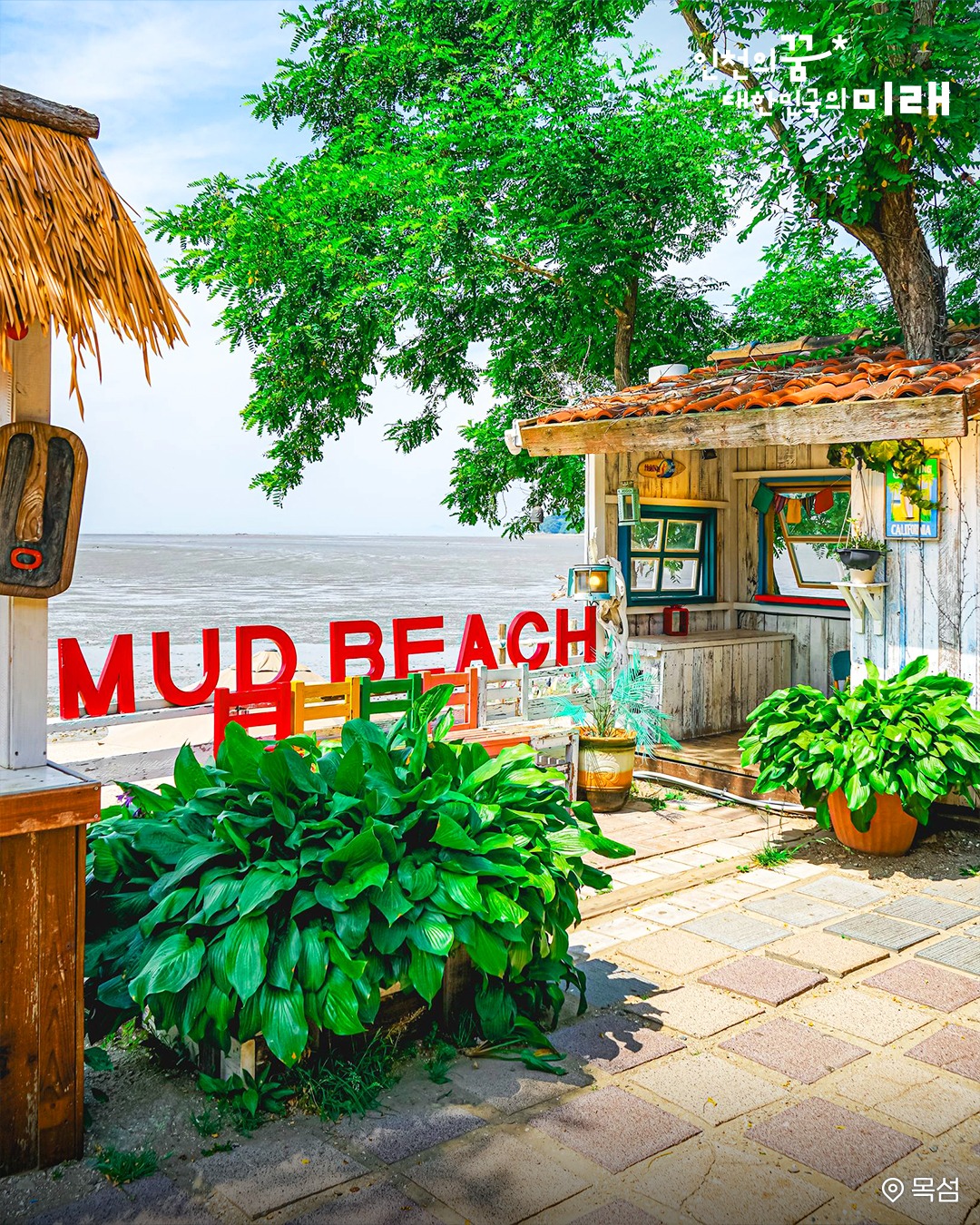 쿠바풍의 카페 인테리어와 함께 목섬과 갯벌을 볼 수 있는