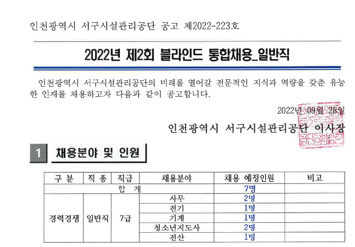 인천광역시서구시설관리공단 2022년 제2회 블라인드 통합채용 (일반직)