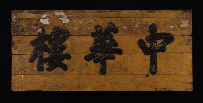 인천시립박물관이 소장하고 있는 중화루 간판 중 직사각형의 간판은 가로로 긴 5개의 목재 판자를 붙인 후 그 위에 '中華樓(중화루)' 글자를 새겨 넣었습니다. 글씨의 가장자리를 얇은 선으로 음각하고 그 내부를 검은 색으로 칠한 것입니다. 바탕은 황색으로 칠해져 있는데 그 여백에 중국의 옛 그릇과 화초 등을 소재로 그린 그림인 기명절지(器皿折枝) 문양이 양각되어 있습니다. 간판의 오른쪽에는 '壬戌仲春(임술중춘)'이라 새겨져 있어 이 간판이 1922년 음력 2월에 만들어진 것을 알 수 있습니다. 왼쪽에는 제작자로 추정되는 '傅培桐(부배동)'이라는 글자와 '傅培桐印(부배동인)', '占陽(점양)'의 인장 2개가 새겨져 있습니다. 이 간판은 중화루 1층 우측 출입구 위에 부착되어 있던 것으로 보입니다.