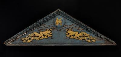 다른 하나는 삼각형 모양이며 길이 3.5m, 높이 1.1m의 대형 간판입니다. 중화루 건물의 2층과 3층 사이에 장식용으로 걸려있던 이 간판은 마주 보고 있는 두 마리의 용이 여의주를 가지고 구름 위를 나는 장면을 묘사하고 있습니다. 삼각형의 상단 두 변에는 톱니모양의 거치형과 여의두문으로 깎은 목재 부재를 부착하여 장식하였습니다. 상단 중앙에 부착된 여의주 모양의 목재에는 얇은 철판으로 만들어진 '新(신)' 자가 부착되어 있는데, 목재에는 '中(중)' 자의 음각 자국이 선명하게 남아 있어 간판의 변화상을 알 수 있습니다.