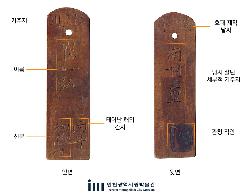 앞면과 뒷면에는 이름, 태어난 해, 거주지, 신분(또는 직책) 등 개인정보가 새겨져 있었습니다. 특히 뒷면에는 관청 직인이 새겨져 있어 위조를 방지했습니다.