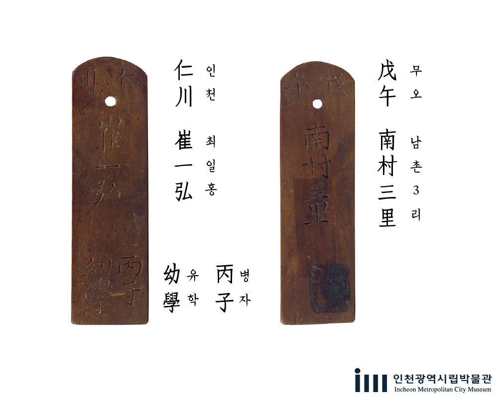 인천시립박물관에는 조선시대 호패 3점이 전시되어 있습니다. 각 호패는 소지자의 이름, 거주지 등을 알 수 있는 귀중한 자료입니다.