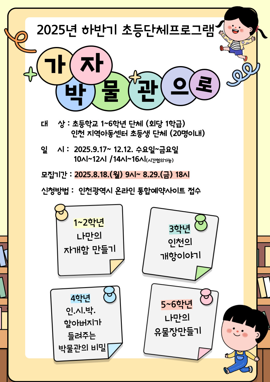 인천시립박물관 2025년 하반기 초등교육프로그램 <가자! 박물관으로>에 선정된 단체를 발표합니다.